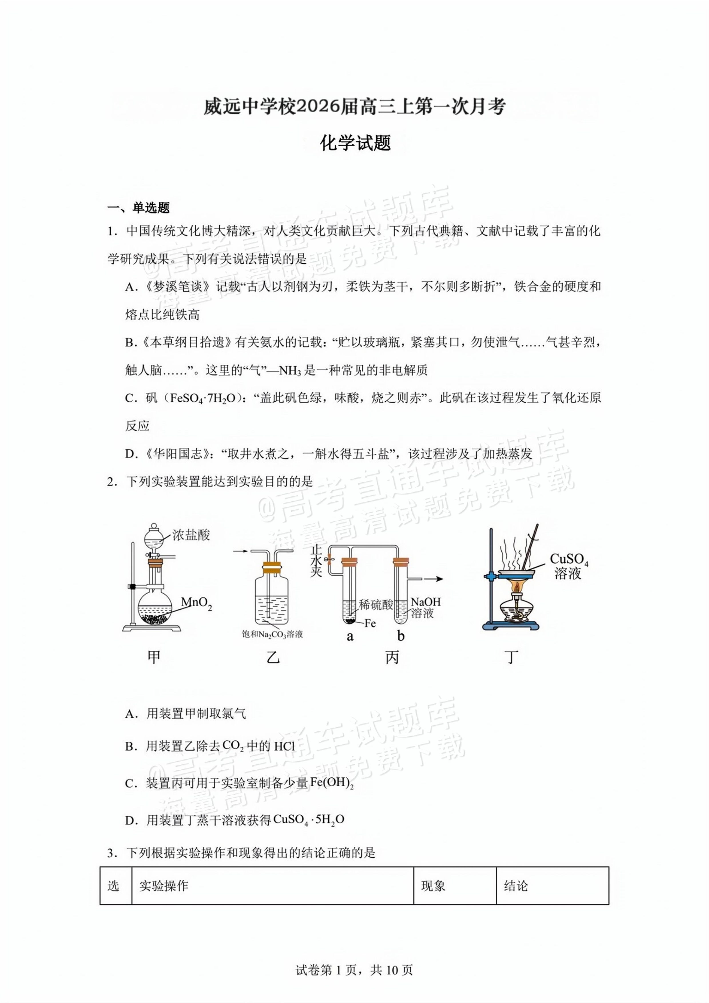 2026四川内江威远中学高三上学期第一次月考化学试题及参考答案