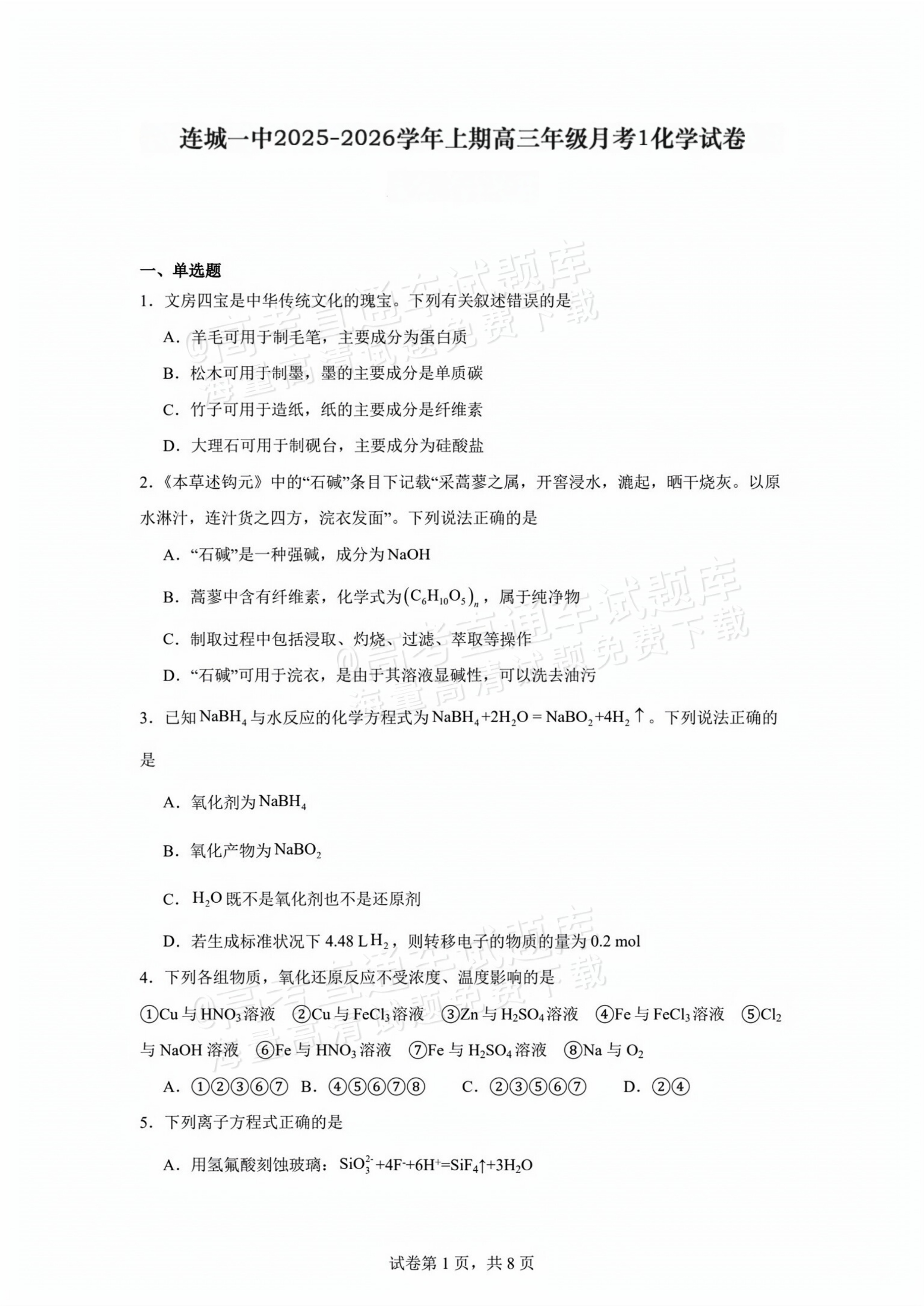 2026福建龙岩连城县第一中学高三10月月考化学试题及参考答案更新中,查看更多2026福建龙岩连城县第一中学高三10月月考模拟预测试卷及答案可点击:2026福建龙岩连城县第一中学高三10月月考各科试题及参考答案汇总,新都网高考信息平台分享的2026福建龙岩连城县第一中学高三10月月考模拟预测试卷及答案是具有极高参考价值的高考模拟信息卷&押题卷答案,可供考生考前模拟预测或押题参考。
