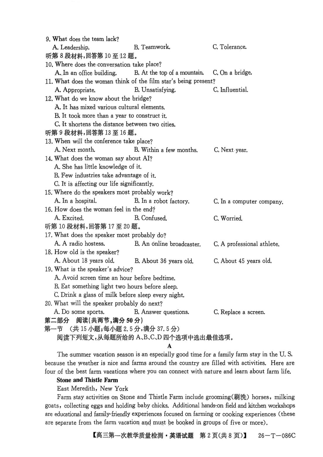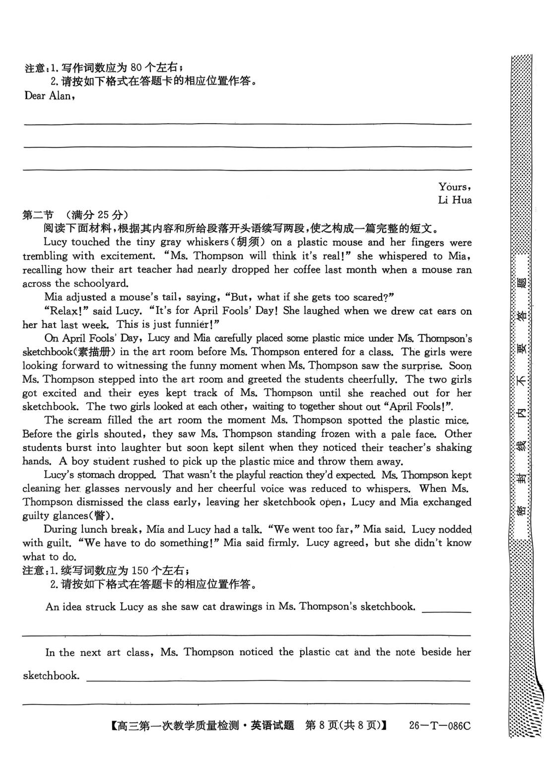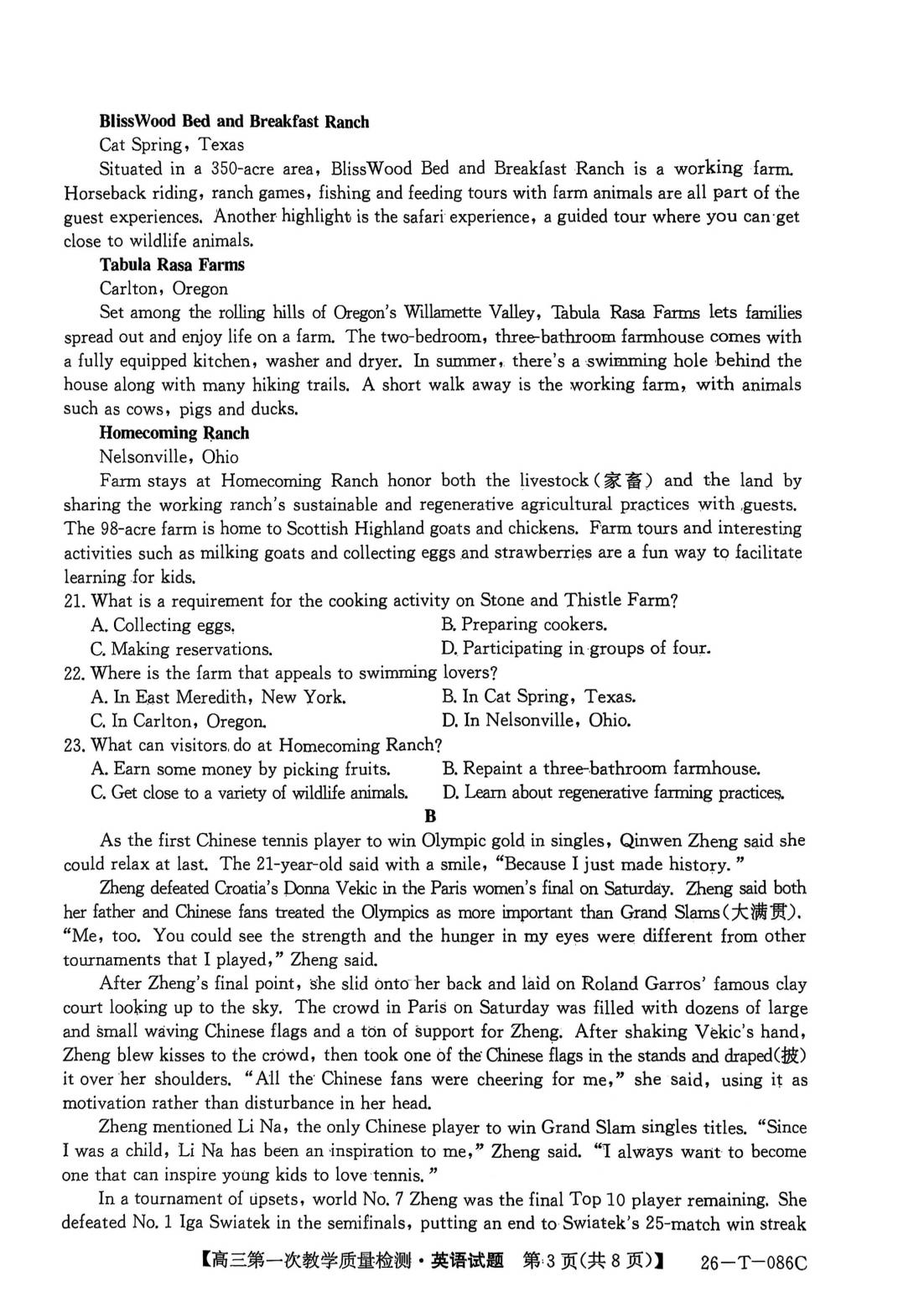 2026安徽阜阳市太和中学高三上第一次教学质量检测英语试题及参考答案