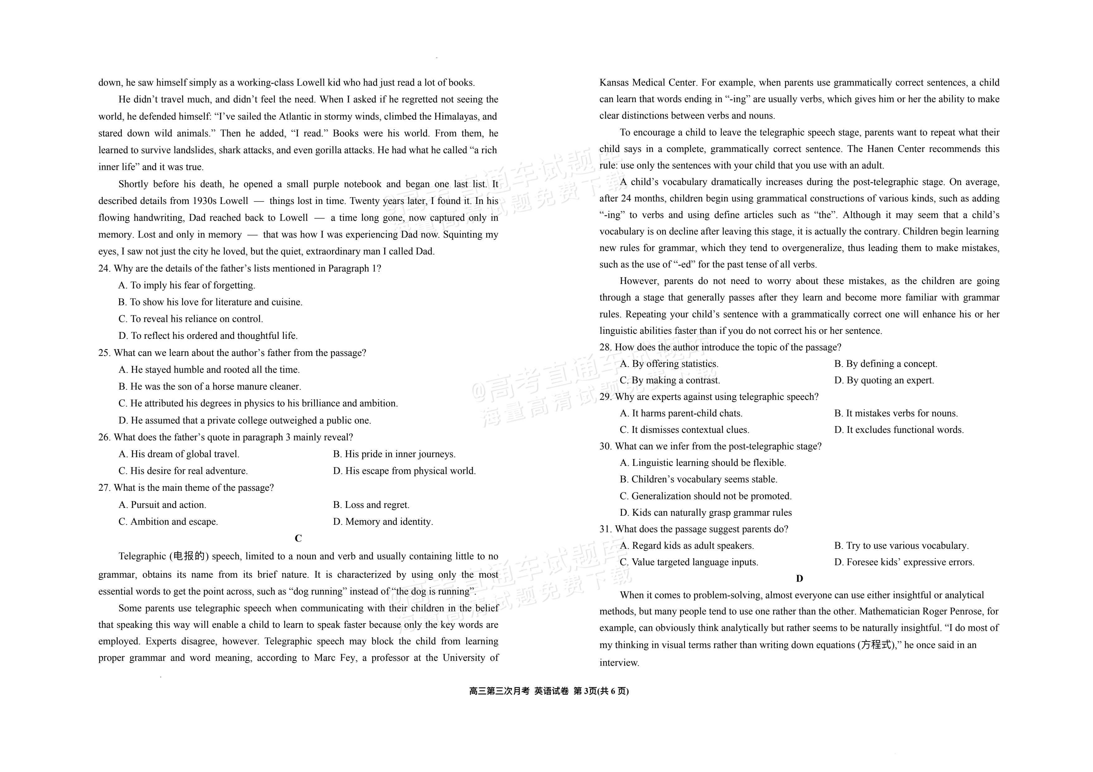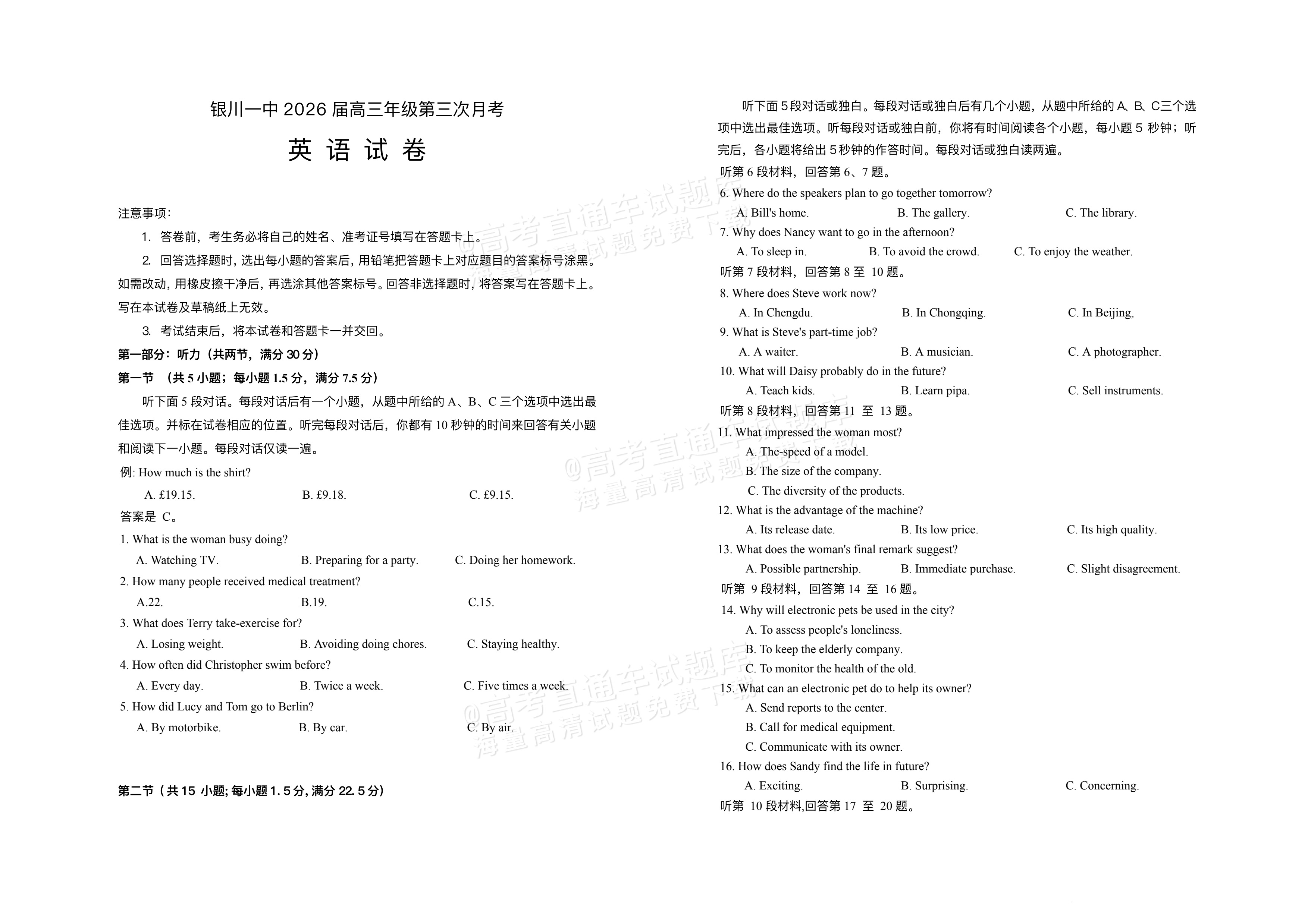 2026宁夏银川一中高三上第三次月考英语试题及参考答案