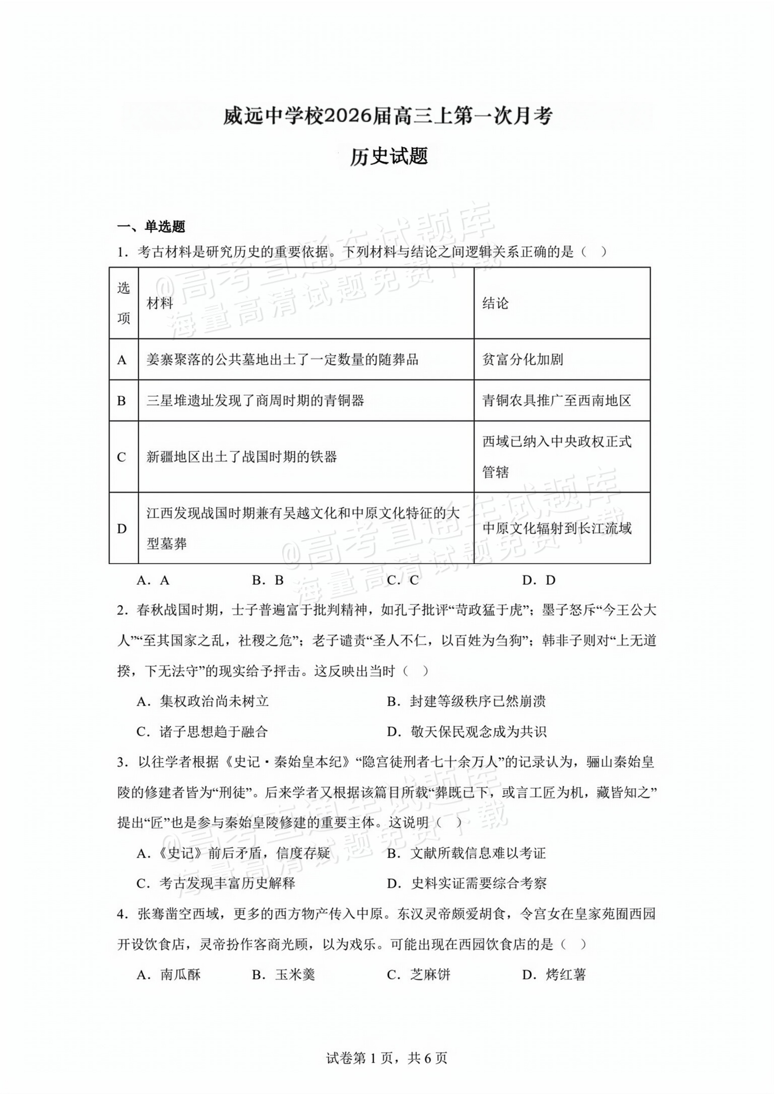 2026四川内江威远中学高三上学期第一次月考历史试题及参考答案